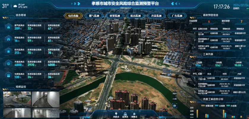 建設運行監測場景,將影響市民日常生活的防汛排澇、橋梁、井蓋等城市保障事項納入平臺管控范圍,利用物聯網技術,截至目前實現對主城區176個內澇點、4689個智能井蓋、14座橋等、七座大型戶外廣告梁生命線基礎設施實時監測、分析研判、風險預警、監督管理、協同處置和信息共享,相關警情及時推送至相關單位進行風險處置,提高城市生命線安全工程運行監測預警處置時效性,初步形成城市安全“一網統管”。