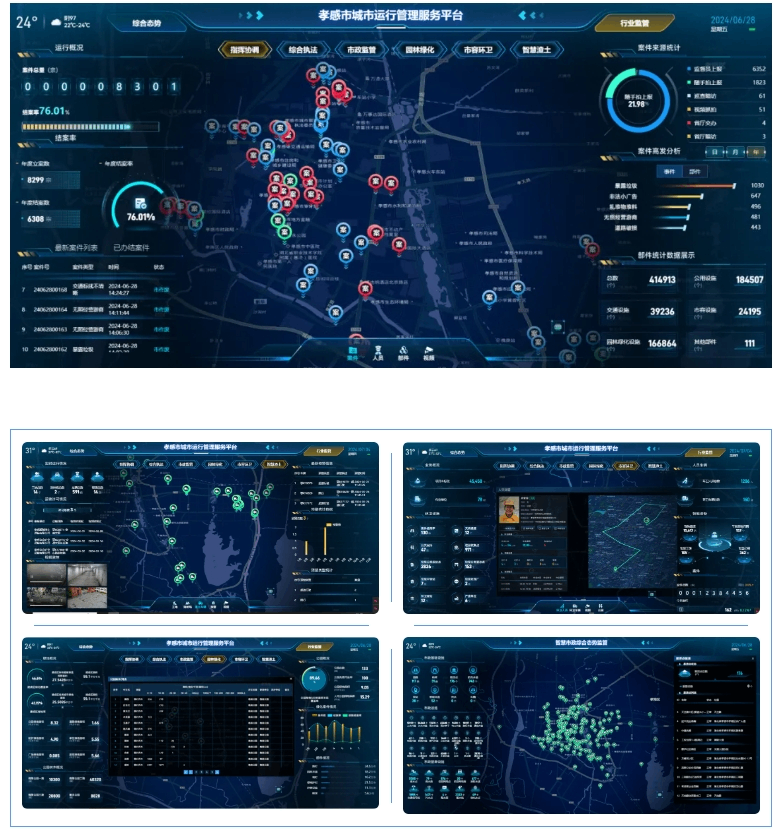 孝感市城市運行管理服務平臺以城市綜合治理“一網統管”、城市運行安全“一屏通覽”、融合智慧調度“一鍵聯動”為建設目標,應用互聯網、大數據、人工智能技術,形成“一網、一庫、一腦、一中心、N應用”的總體架構。平臺涵蓋業務指導、指揮協調、公眾服務、運行監測、綜合評價、數據匯聚、數據交換、應用維護、行業應用10個系統,增強城市管理統籌協調能力以及提升城市運行效率和風險管控水平。