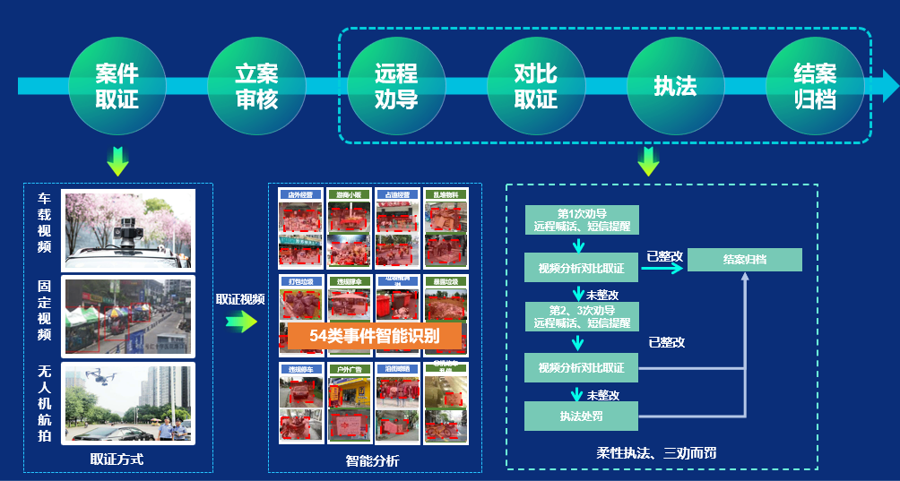 運用大數(shù)據(jù)信息技術(shù)、視頻智能分析技術(shù),全時段、全方位、敏捷高效地自動識別違章停車、出店經(jīng)營、無照游商等違規(guī)事件,形成有效的視頻證據(jù),派送至執(zhí)法部門,并自動將違法事實處罰決定通知到當(dāng)事人,實現(xiàn)零口供辦案,為執(zhí)法人員實施“非接觸式”執(zhí)法提供證據(jù)鏈,破解城市管理執(zhí)法成本高、依法取證難等問題,有效減少執(zhí)法正面沖突和糾紛,提高執(zhí)法辦案效率。