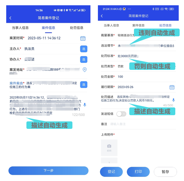 按照《行政處罰法》的要求,萬州區(qū)智慧城管綜合執(zhí)法系統(tǒng)嚴(yán)格按照自由裁量權(quán)標(biāo)準(zhǔn)將案件受理、立案、調(diào)查、處罰、執(zhí)行等執(zhí)法環(huán)節(jié)在平臺中建立規(guī)范化的執(zhí)法流程,規(guī)范每個環(huán)節(jié)、每個崗位的要求,從源頭上約束和規(guī)范執(zhí)法行為。通過對法律法規(guī)、自由裁量權(quán)、執(zhí)法文書進行結(jié)構(gòu)化編碼處理,實現(xiàn)法律法規(guī)在線查詢、執(zhí)法案由智能推選、執(zhí)法文書標(biāo)準(zhǔn)輸出、自由裁量規(guī)范使用,執(zhí)法隊員選擇相應(yīng)執(zhí)法事項后,系統(tǒng)自動關(guān)聯(lián)違則、罰則、自由裁量標(biāo)準(zhǔn)等,幫助執(zhí)法隊員用好法、用對法,不再需要執(zhí)法隊員花很大功夫去查閱資料,避免人情執(zhí)法、經(jīng)驗執(zhí)法,從源頭保障法律的執(zhí)行能夠公平公正。
