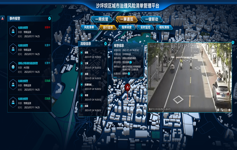 沙坪壩區城市治理風險清單管理,以控城市大風險,防城市大事故為工作目標,全面推行城市治理風險清單管理制度,構建起城市治理風險“識別、評估、處置、防范”閉環管理模式。通過對城市運行風險隱患的事部件進行分級分類編碼管理,利用風險隱患等級升降算法、人防+技防智能防控手段,實現對各類風險隱患的動態監測、及時預警、快速響應、高效處置,建立起跨層級、跨地域、跨系統、跨部門、跨業務的多跨協同快速反應機制,筑牢城市運行安全防護網。