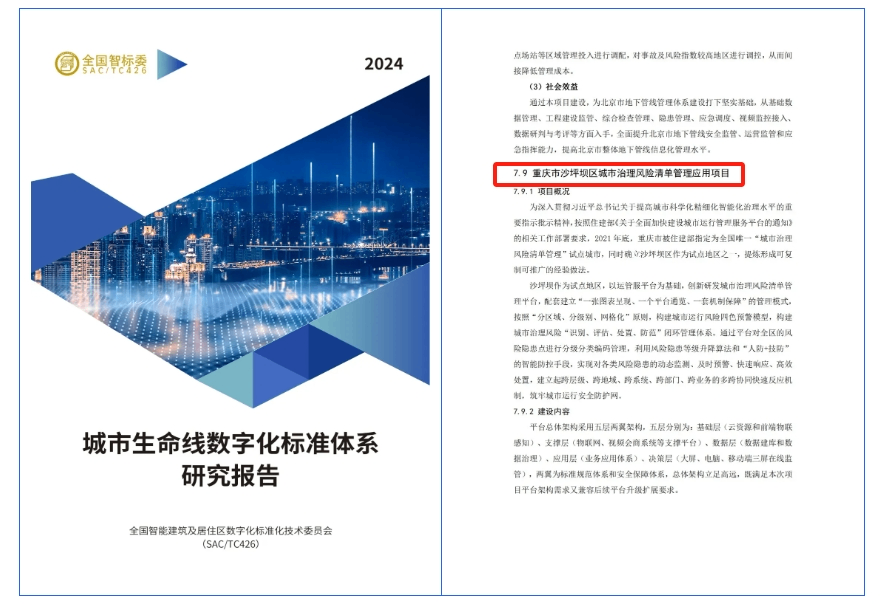數字時代,城市生命線正經歷著前所未有的變革。在全國智標委發布的《城市生命線數字化標準體系研究報告》中,“重慶市沙坪壩區城市治理風險清單管理應用項目”作為“典型城市生命線數字化實踐案例”成功入選。