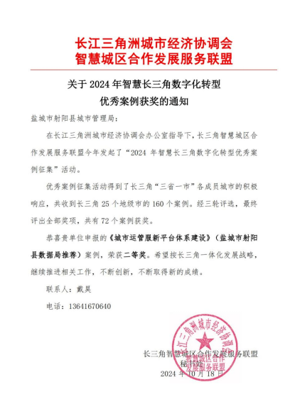 在長三角智慧城區合作發展服務聯盟今年發起的2024 年智慧長三角數字化轉型優秀案例征集大賽中,射陽縣城市管理局申報的《城市運管服新平臺體系建設》案例,成功摘得二等獎殊榮。