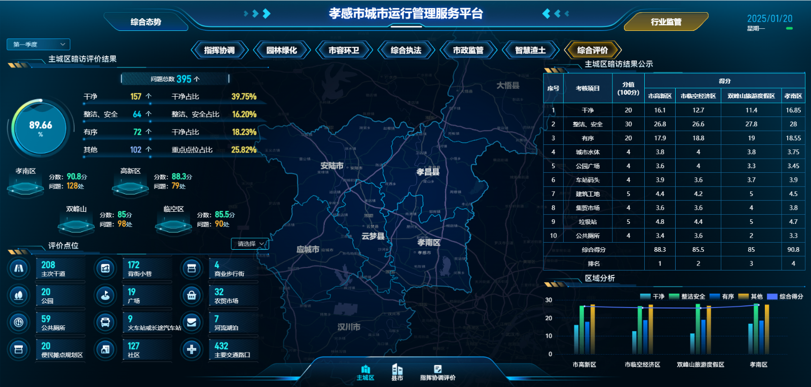 按照住建部《城市運(yùn)行管理服務(wù)平臺(tái)管理監(jiān)督指標(biāo)和評(píng)價(jià)標(biāo)準(zhǔn)》(CJ/T551-2023),圍繞“干凈、整潔、有序、安全”,定期、不定期對(duì)稱抽查10個(gè)縣(市、區(qū))城市管理工作情況,實(shí)地考察主次干道、背街小巷、公園廣場(chǎng)、便民疏導(dǎo)點(diǎn)等城市管理重點(diǎn)部位,定期公布綜合評(píng)價(jià)結(jié)果,不定期提示城市治理突出問(wèn)題,不斷提升城市治理效率,提高精細(xì)化管理水平。