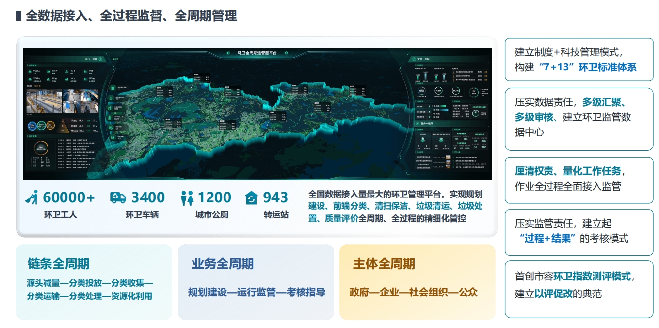 深圳市環衛全周期運管服平臺順應“城市管家”“街區制”城市管理新模式,落實環衛高質量發展行動計劃,在充分整合共享已有環衛信息化成果基礎上,利用物聯網、大數據、云計算、AI智能、CIM、塊數據等最新技術,運用全生命周期管理理念搭建的業務全周期、鏈條全周期、主體全周期為一體的數字化平臺。經過1年多的運行與實踐,目前已形成“市、區、街道”三級聯動、“政府、企業、社會”三端融合、“開放、協同、共享”應用生態,初步實現環衛一網統管格局,助力打造文明潔凈城市。